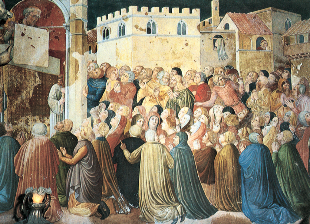 assistono all’evento; colpisce la ricerca fisionomica ed espressiva delle singole figure, tra le quali campeggia al centro della composizione un vecchio, che con le braccia alzate ringrazia Dio del dono del prodigio.
