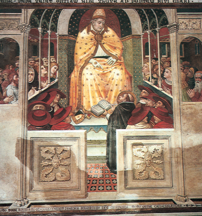Stupente curia; per summum pontificem deliberatum est, quod festum corporis christi per universam ecclesiam celebraretur, imposuitque S. Thoma de Aquino ordinis predicatorum, ut officium Corporis Christi conficeret secundum usum omnium ecclesiarum, Volsinii depictum est miraculum sacerdotis celebrantis; depictus quoque S. Thomae sedens in cathedra circumstante curia hujus sacramenti officium dictans. Ultimo depictus est crucifixus alloquens sanctum Thomam, et dicens: bene scripsisti de me Thoma…