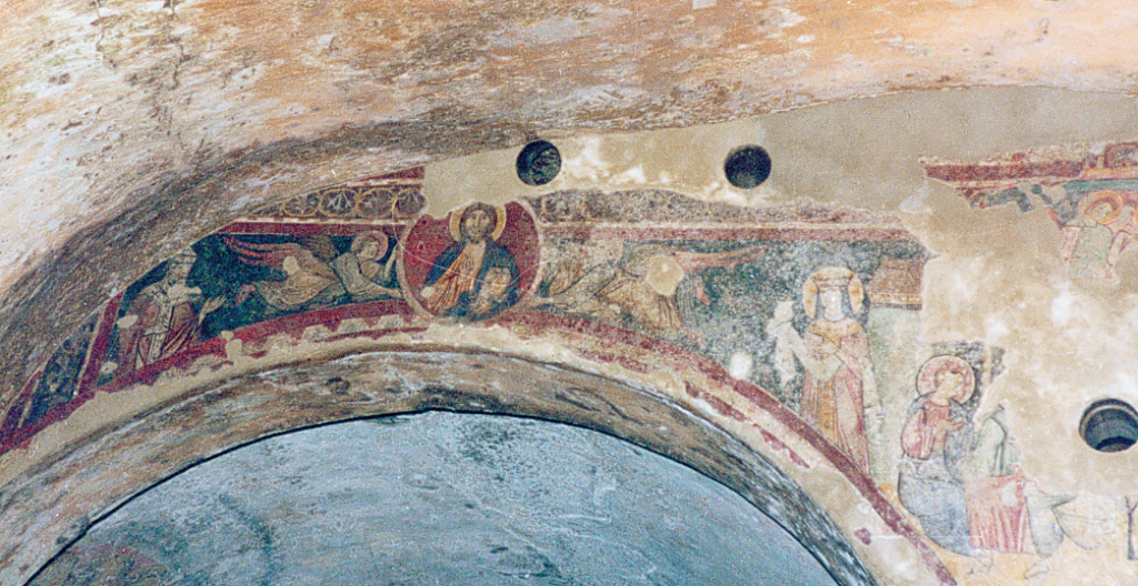 Sull’arco, che dal vano-nartece immette nella basilichetta ipogea di santa Cristina, è un grande affresco, riportato alla luce nel 1963, databile alla seconda metà del XIII secolo o agli inizi del XIV. L’interpretazione iconografica è enigmatica e controversa. All’estrema sinistra è la figura di un pontefice privo di aureola,